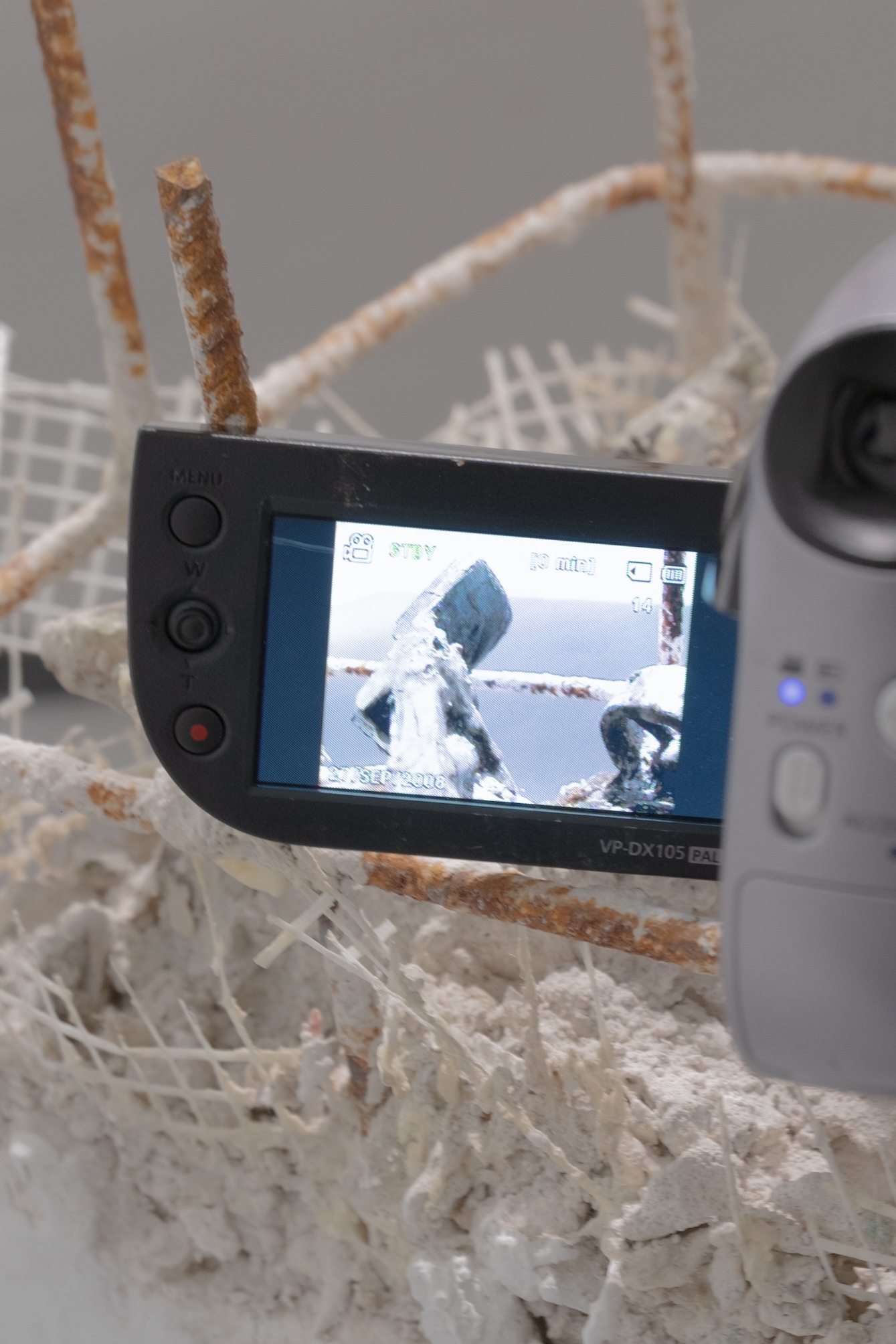 Interactivity in contemporary art exhibitions often becomes non-interactive after a few days due to inappropriate use. Beyond is a sculptural work that, despite its fragile, delicate appearance, encourages interaction—viewers can use a fixed camera. Such interaction not only shifts the perspective of the sculpture and the viewer, but also tests the moment of interactivity — does something that appears fragile elicit more cautious behavior? Just as archaeological finds discovered during construction paralyze the process and demand sensitive caution. Noisy machines are replaced by delicate tools, the site is taken over by archaeological specialists, and it is no longer clear when construction can continue.
